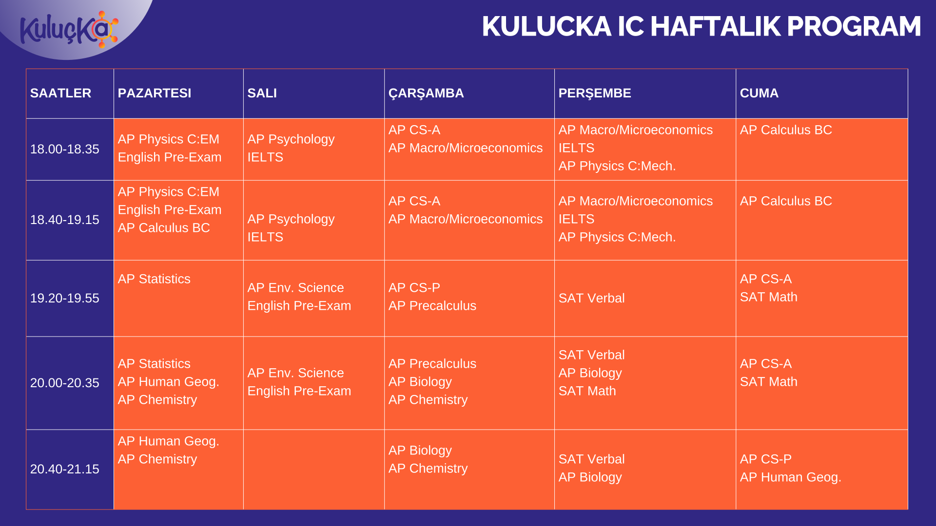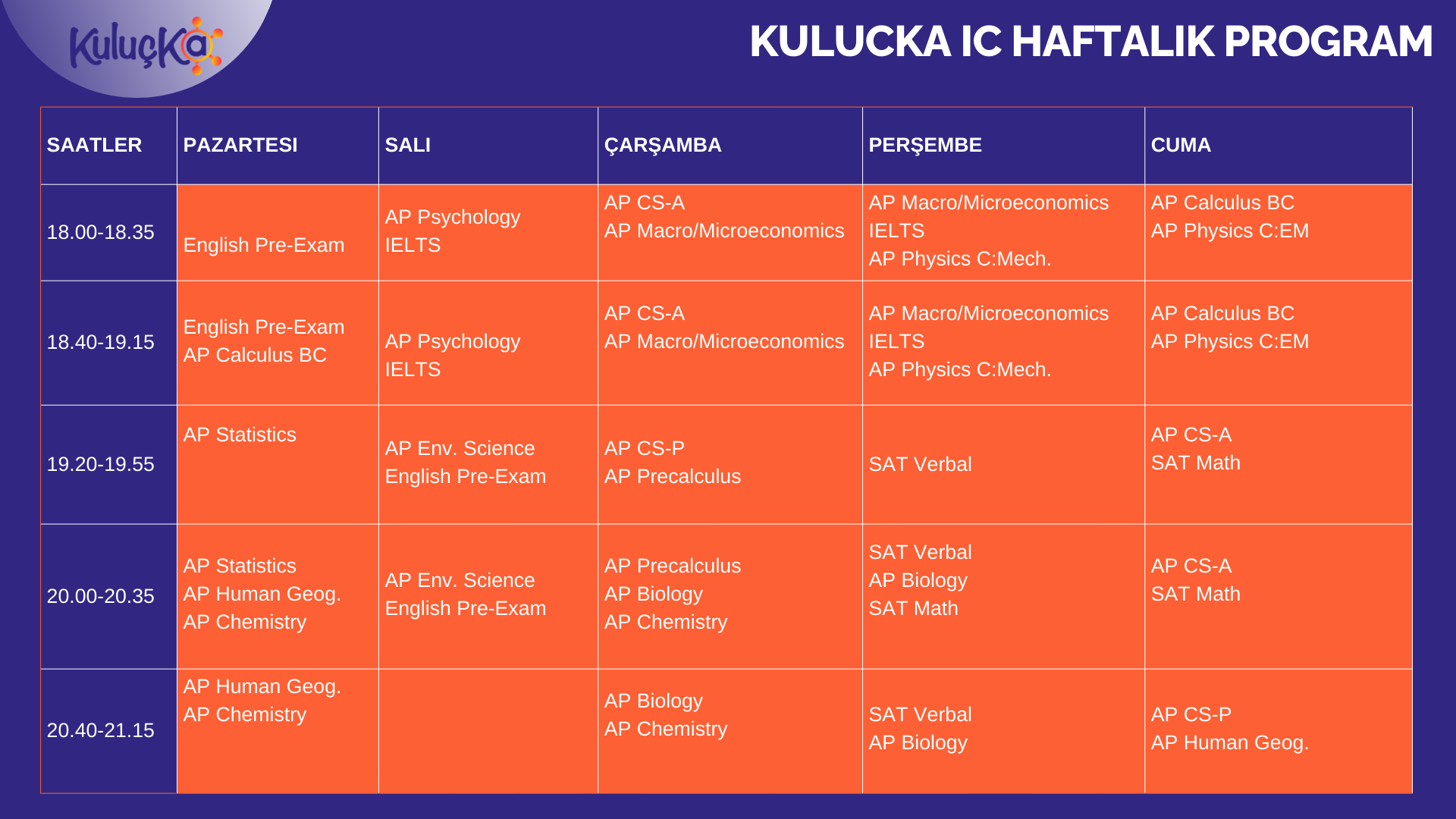 Her AP dersi; haftalık 4 saatlik yapılandırılmış ders, konu anlatımları, problem çözme oturumları ve deneme sınavlarını içerir.